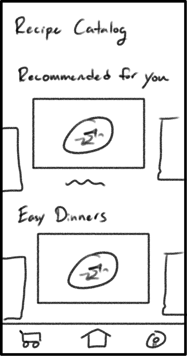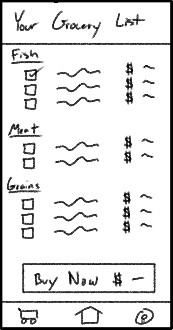 - First, this screen optimizes users' existing grocery trips by breaking down what they need to buy for the week. Inspired by the grocery receipts at Safeway / Vons, we categorize every ingredient into the general area you may find it at a typical grocery store. We then display these items together to avoid users doubling back for later ingredients.