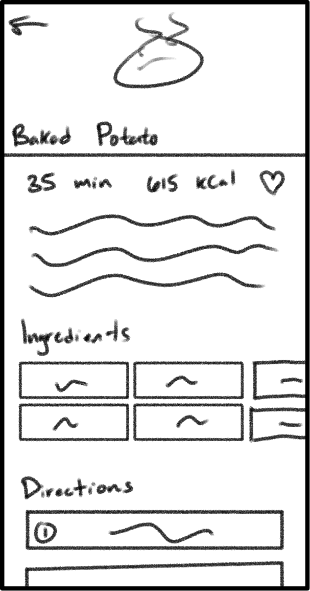 This screen is meant to show users everything they'd want to know about a particular recipe. This includes things like a short description, the ingredients required, and the directions to make it.